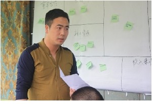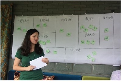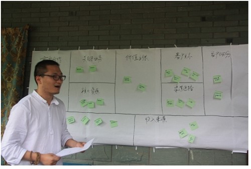 (圖為中國(guó)第一旅行女裝――綻放品牌創(chuàng)始人安麗(“茉莉”女士)按照曹老師提出的九步商業(yè)模式對(duì)自家企業(yè)進(jìn)行分析講解,并提出自身公司存在的優(yōu)勢(shì)與問(wèn)題)
