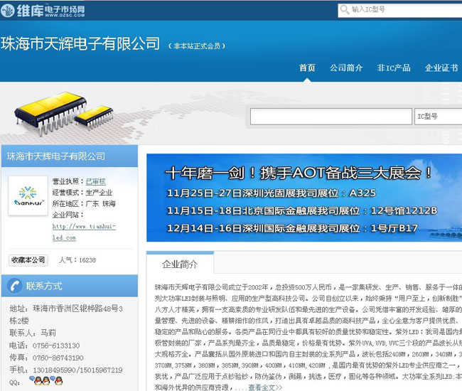 客戶公司簡介:珠海市天輝電子有限公司成立于2002年,總投資500萬人民幣,是一家集研發(fā)、生產(chǎn)、銷售、服務(wù)于一體的專業(yè)紫外LED,全系列大功率LED封裝與照明、應(yīng)用的生產(chǎn)型高科技公司。公司自創(chuàng)立以來,始終秉持“用戶至上,創(chuàng)新制勝”的經(jīng)營理念,招攬八方人才精英,擁有一支高素質(zhì)的專業(yè)研發(fā)隊(duì)伍和最先進(jìn)的生產(chǎn)設(shè)備。公司憑借豐富的開發(fā)經(jīng)驗(yàn)、雄厚的技術(shù)力量、嚴(yán)謹(jǐn)?shù)馁|(zhì)量管理、先進(jìn)的設(shè)備、精耕細(xì)作的作風(fēng),打造出具有卓越品質(zhì)的高科技產(chǎn)品,全心全意為客戶提供優(yōu)質(zhì)、安全、節(jié)能、環(huán)保、穩(wěn)定的產(chǎn)品和貼心的服務(wù)。各類產(chǎn)品在同行業(yè)中都具有較好的質(zhì)量優(yōu)勢和穩(wěn)定性。