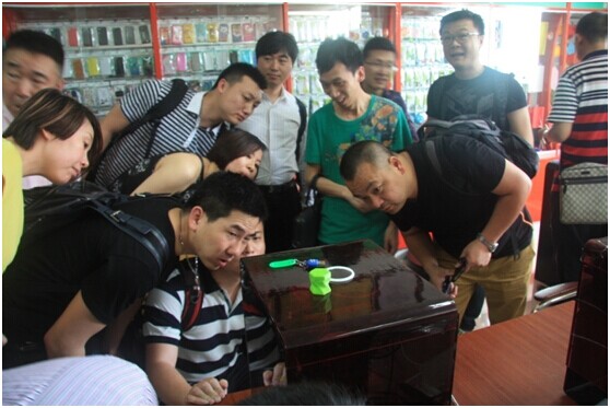 (圖為共創(chuàng)會(huì)會(huì)員紛紛探究桌面3D打印機(jī)的運(yùn)作模式)