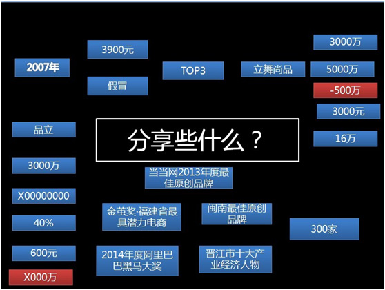 2014年度阿里巴巴黑馬獎得主、晉江十大產(chǎn)業(yè)經(jīng)濟(jì)人物,最佳原創(chuàng)男裝潮品牌【品立】創(chuàng)始人,一個比女人還漂亮的男人,在分享他從傻B到騷B的磐涅過程( 創(chuàng)業(yè)7年,他用思維改變了商業(yè)模式,同時也被商業(yè)所改變。從通過線上平臺賣斷鞋賺取辛苦費(fèi),到自創(chuàng)男裝品牌,依靠打造爆款成為知名淘品牌;從慘烈競爭虧損嚴(yán)重,到走調(diào)性,適時推出中高端品牌,發(fā)起新的電商突圍,并在短短半年取得了突出的成績。)!每個人成功的背后一定有他的故事,至少他的堅(jiān)韌與堅(jiān)持、頑強(qiáng)與執(zhí)著,敢想敢要敢突破就是他最好的特質(zhì)。