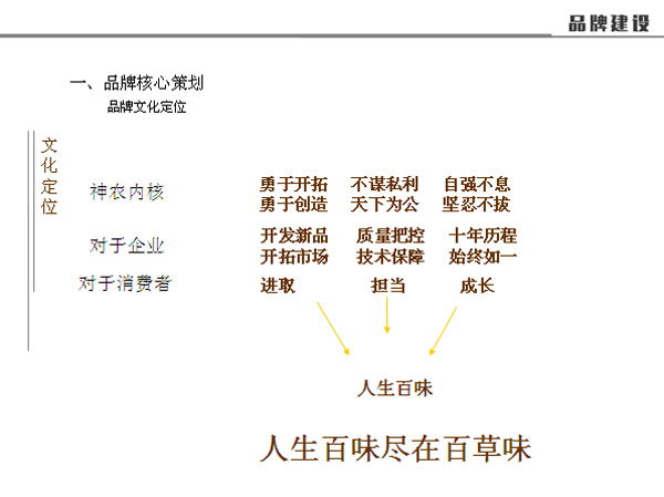 文化核心建設(shè)四步走:發(fā)掘文化的力量,進(jìn)行文化梳理;擁有獨(dú)特個(gè)性,進(jìn)行策略制定;分享共同的價(jià)值觀,運(yùn)用調(diào)性定位語(yǔ)與廣告語(yǔ);建立美譽(yù)度與忠誠(chéng)度,利用各媒介案稿。