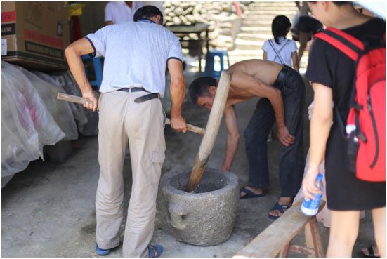 抵達天仙島,島上淳樸的島民已經大張旗鼓地搬出石槽,一鑿一鑿的打麻糍;桌上備好的豐盛午餐,招待我們來訪的共軍。