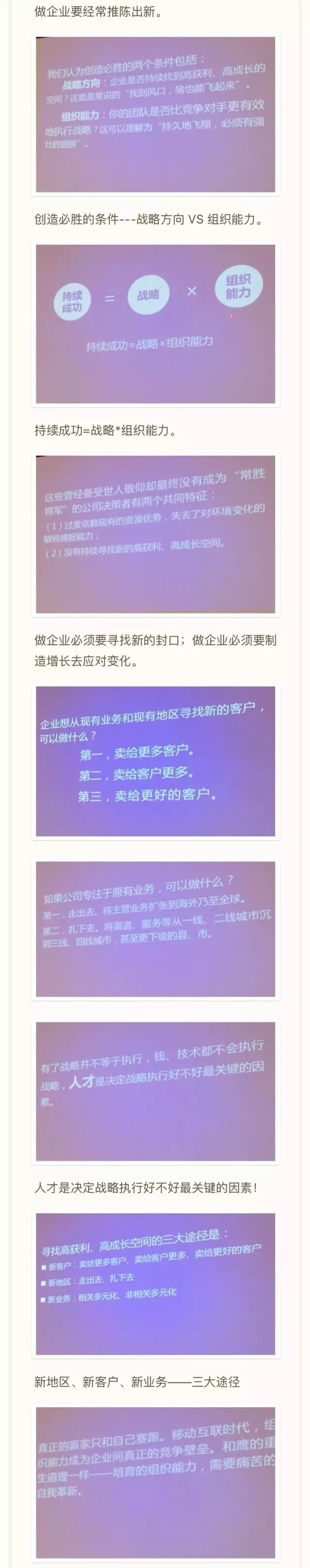 第三是企業(yè)的持續(xù)成功=戰(zhàn)略X組織能力。公司CEO一定要清楚公司的商業(yè)邏輯、組織構(gòu)架,從我5年淺顯的創(chuàng)業(yè)經(jīng)驗(yàn)來看,這兩點(diǎn)其實(shí)不是規(guī)劃出來的,而是邊做邊打版出來的。