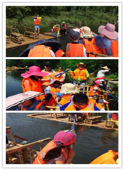 全長水路3.5公里,歷時一小時左右,由專業(yè)筏工點篙撐筏,順莫干山、天目山支流匯合雙溪而下。溪水清澈明凈,水面時有翠鳥、鴨子等出沒,兩岸茶山蔥籠,淡竹林綿延不絕。溪邊有“苧翁垂釣”、“村姑搗衣”,實屬一幅天然水墨風情畫,都市喧囂在此蕩然無存,令總裁們也卸下了平日繁重的工作包袱,與孩子們置身于秀美山水之間,盡情享受著天倫之樂。