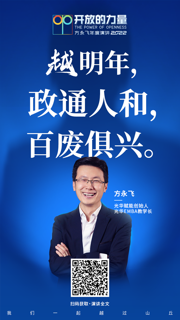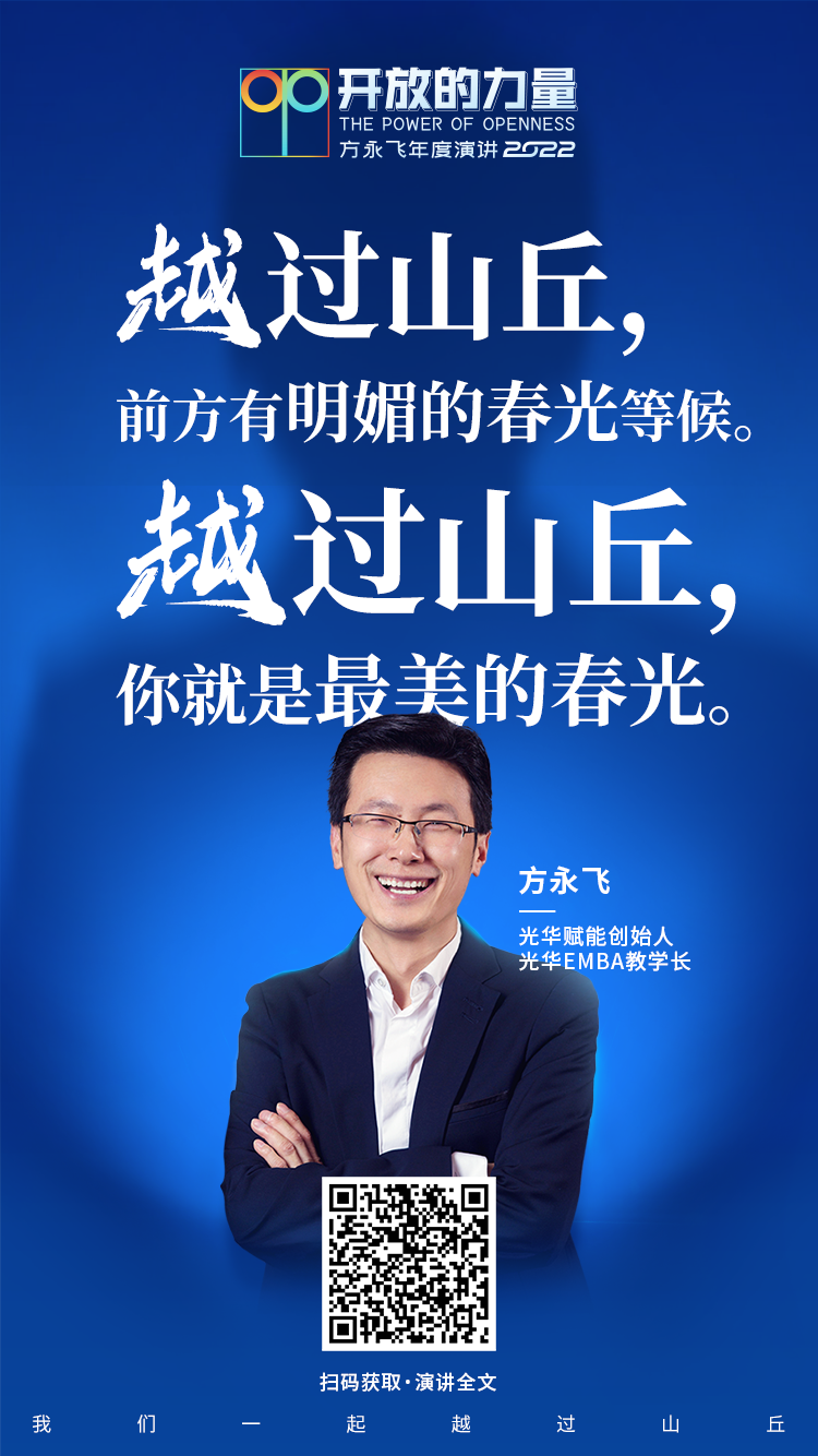 今年“開(kāi)放的力量”演講主題為“我們一起,越過(guò)山丘”,光華賦能董事長(zhǎng)、光華—共創(chuàng)會(huì)EMBA教學(xué)長(zhǎng)方永飛從跨越鴻溝、穿越虛實(shí)、超越自我3大方向,干貨輸出,全場(chǎng)高能,既有宏觀商業(yè)思考,也有具體案例分析,帶領(lǐng)大家走向春暖花開(kāi)的時(shí)代。